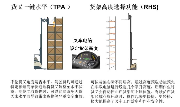 本款叉車獨創(chuàng)性技術一鍵升高到位取貨,