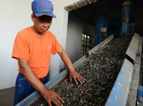 資料圖片:山東省鄒平縣青陽鎮(zhèn)的廢舊電池回收利用公司依靠分布在廣東、浙江、江蘇等地的20多個(gè)回收站回收手機(jī)廢舊電池作為原料,經(jīng)過外殼剝離、粉碎、燒、浸出、萃取、濃縮結(jié)晶等工藝,提取氯化鈷、硫酸鈷、硫酸鎳、電解銅等產(chǎn)品,發(fā)展循環(huán)經(jīng)濟(jì),資源再利用的同時(shí)又保護(hù)環(huán)境。